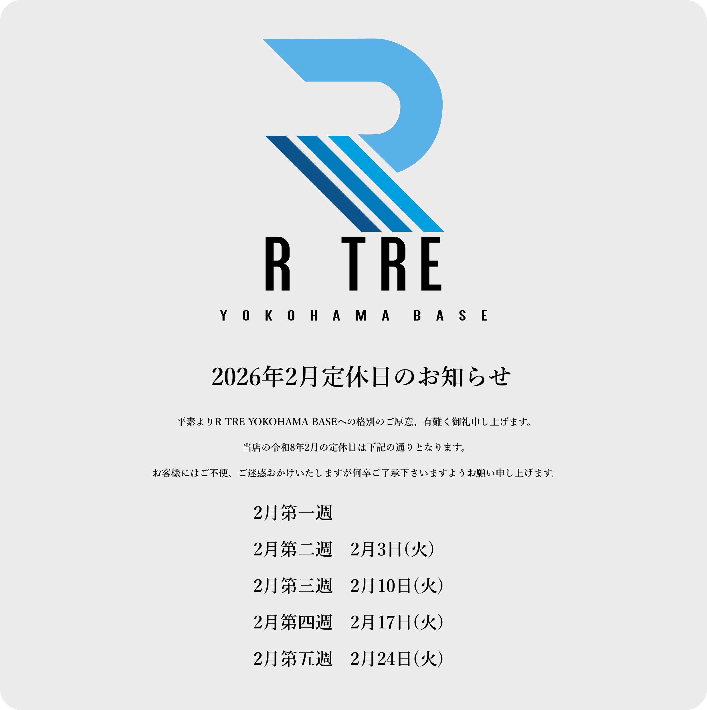 平素よりR TRE YOKOHAMA BASEへの格別のご厚意、有難く御礼申し上げます。