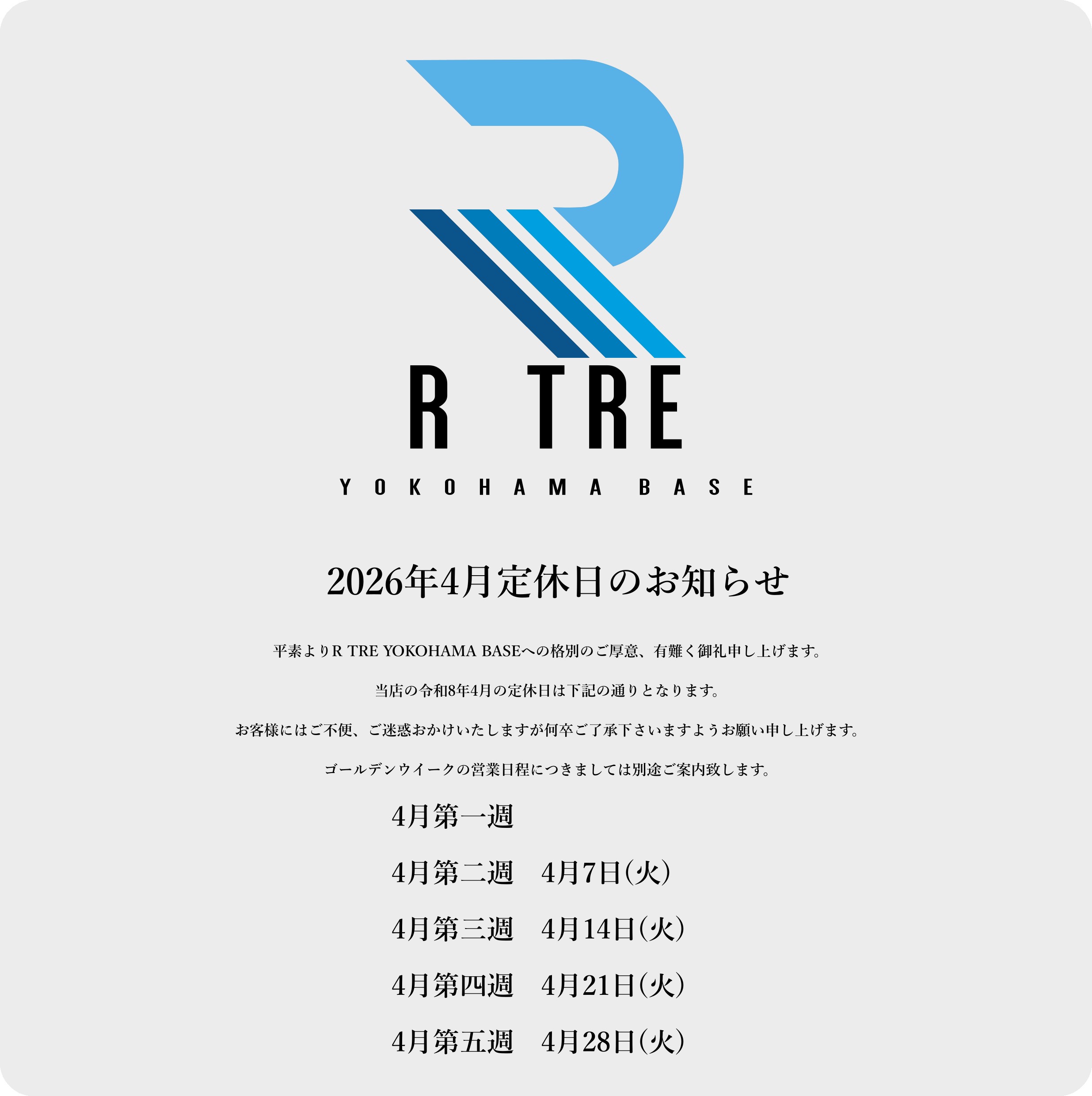 平素よりR TRE YOKOHAMA BASEへの格別のご厚意、有難く御礼申し上げます。