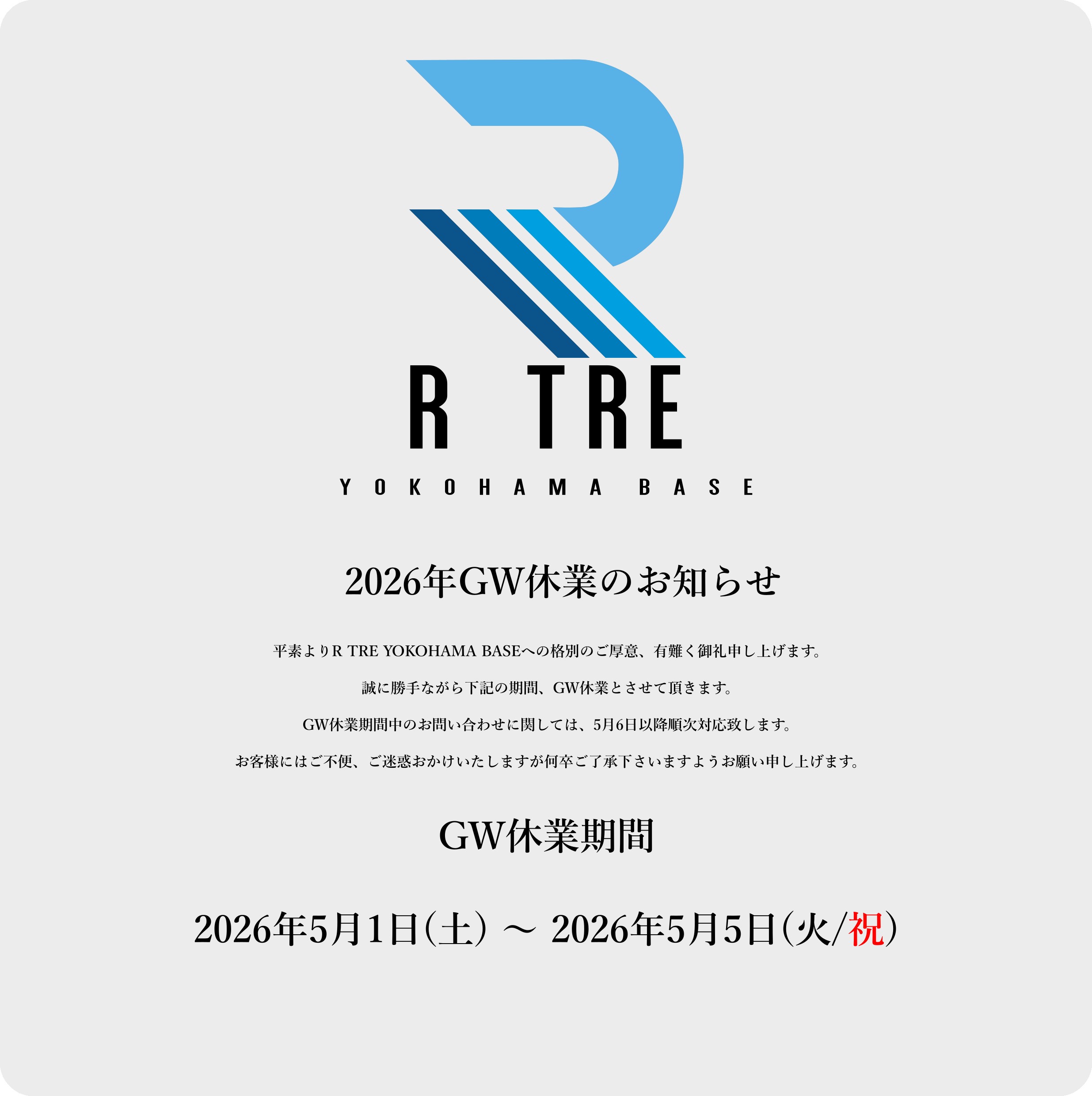 平素よりR TRE YOKOHAMA BASEへの格別のご厚意、有難く御礼申し上げます。